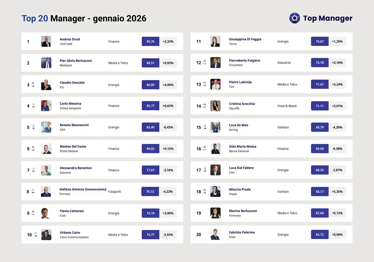 Al tredicesimo sale di tre Pietro Labriola (71.67), Ad di Tim che vive il suo momentum in borsa sfiorando i 12 miliardi di capitalizzazione. Guadagna una posizione l’Ad di Illycaffè Cristina Scocchia (71.11), che chiude il 2025 con un +10% di fatturato nonostante l’incremento del 50% dei costi sulla materia prima. Quindicesimo Luca de Meo (69.79). Al sedicesimo sale di uno l’Ad di Banca Generali Gian Maria Mossa (69.08) con risultati 2025 oltre le attese. Diciassettesimo Luca Dal Fabbro (68.35), al diciottesimo Miuccia Prada (68.17) con le nuove collezioni fa un balzo di quattro. Chiudono la top 20: Marina Berlusconi (67.06) e Fabrizio Palermo (65.72). In Top 200 in crescita: Renzo Rosso (24°,+4); Massimiliano DI Silvestre (26°,+8); Sabrina De Filippis (35°,+4); Ermenegildo Zegna (57°,+7); Vinicio Mosè Vigilante (100°,+34); Aldo Bisio (121°,+26).