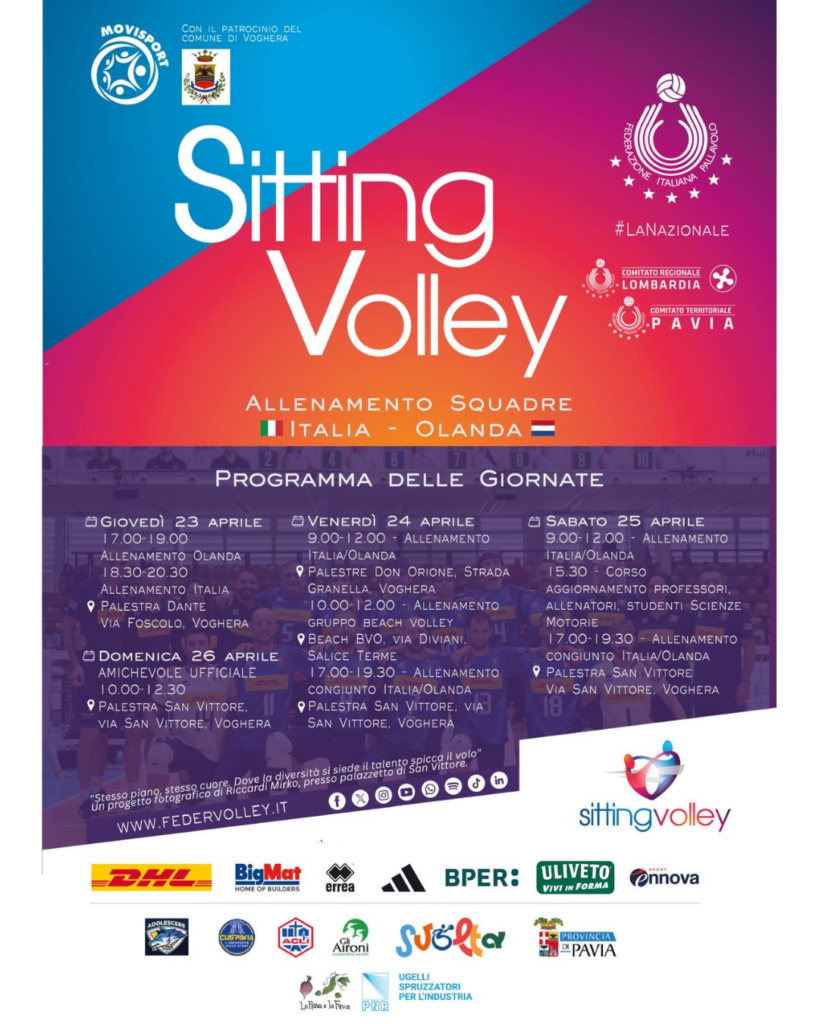 Voghera entra nel calendario della pallavolo paralimpica internazionale. Da oggi, giovedì 23 aprile, e fino a domenica 26, la città ospita il raduno congiunto delle squadre nazionali di sitting volley di Italia e Olanda, un appuntamento organizzato con il patrocinio del Comune e il supporto della Federazione Italiana Pallavolo, del Comitato Regionale Lombardia e del Comitato Territoriale di Pavia.