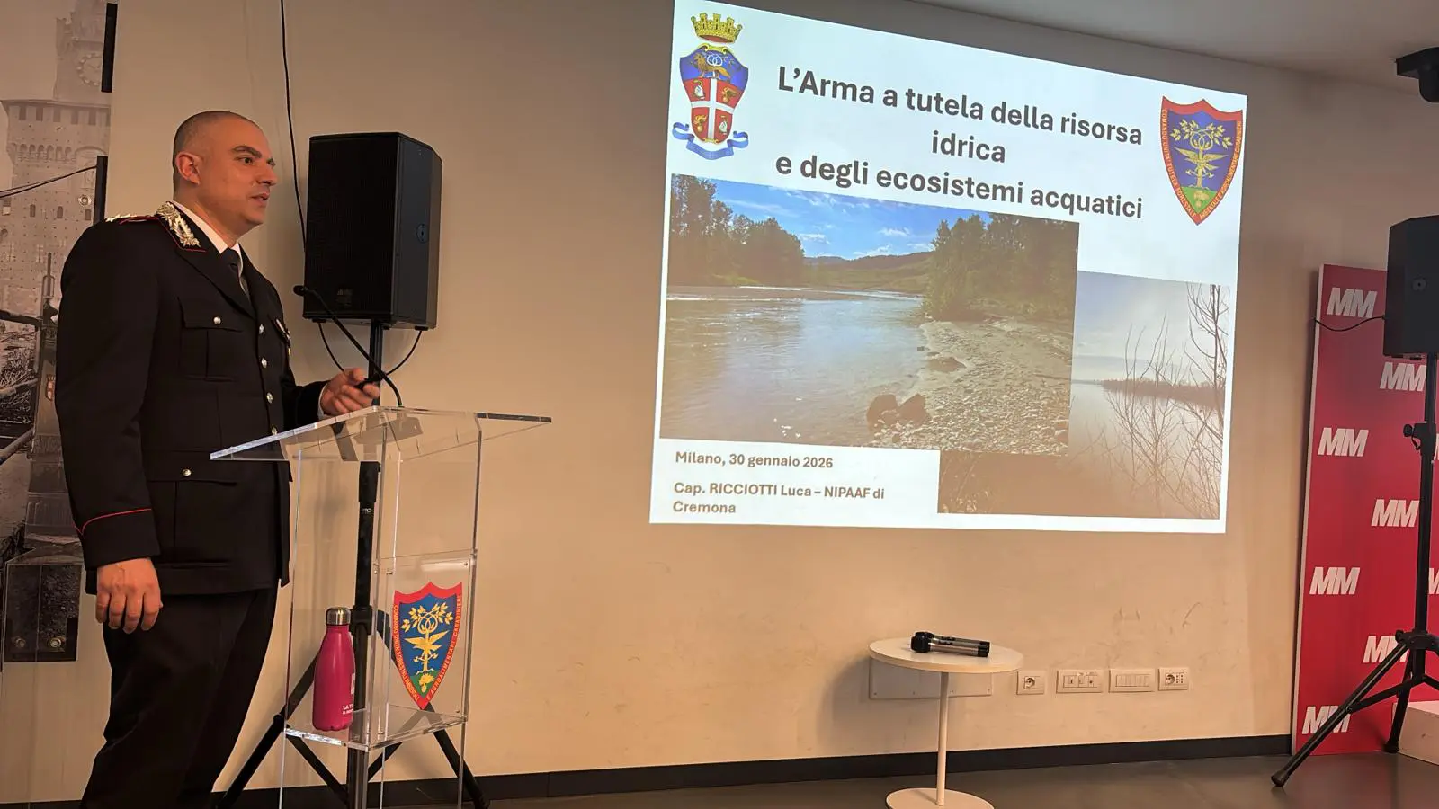 Proprio sul tema della gestione dei fiumi è intervenuto Dario Kian di ERSAF (Ente Regionale per i Servizi all’Agricoltura e alle Foreste) Regione Lombardia sul tema dei Contratti di fiume: uno strumento che Regione Lombardia ha individuato come strumento per la riqualificazione dei bacini fluviale e al miglioramento della qualità delle acque. “I numeri sono rilevanti, ha detto Kian, in quanto in Lombardia sono interessati: 498 comuni, 9.704 Km2 di territorio e 5.504.341 abitanti. Sono i coinvolti i principali corsi d’acqua: l’ Adda, l’Olona, il Lambro settentrionale, la Media Valle del Po, il Mincio, il Seveso e altri reticoli minori”. “I Contratti di Fiume, ha aggiunto Kian, sono accordi volontari tra Comuni, Province, ARPA, Comunità Montane, Associazioni, privati che hanno responsabilità nella gestione e nell’uso delle acque, nella pianificazione del territorio e nella tutela dell’ambiente. Permettono di elaborare programmi d’azione concreti, condivisi e partecipati quali risultati di una governance innovativa che persegue i concetti di multidisciplinarità e pluralità di obiettivi”. Ha aperto l’incontro il Generale di Brigata. Benito Castiglia comandante della Regione Carabinieri Forestale “Lombardia”. Sono intervenuti Andrea Piccin – della Direzione Generale Territorio e Sistemi Verdi di Regione Lombardia, Valeria Marchesi e Bruno Zonca di ARPA Lombardia.