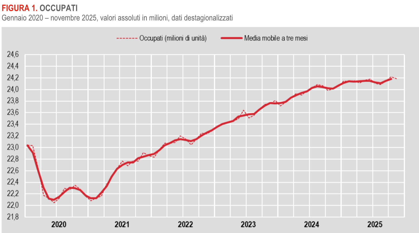 ROMA (ITALPRESS) – A novembre 2025 il numero di occupati, pari a 24 milioni 188mila, è in calo rispetto al mese precedente. La diminuzione coinvolge i dipendenti a termine (2 milioni 477mila) e gli autonomi (5 milioni 215mila), mentre risultano sostanzialmente stabili i dipendenti permanenti (16 milioni 496mila). Lo stima l’Istat, aggiungendo che l’occupazione aumenta rispetto a novembre 2024 (+179mila occupati in un anno), come sintesi della crescita dei dipendenti permanenti (+258mila) e degli autonomi (+126mila) parzialmente compensata dal calo dei dipendenti a termine (-204mila). Su base mensile, il tasso di occupazione e di disoccupazione scendono al 62,6% e al 5,7% rispettivamente, mentre il tasso di inattività sale al 33,5%. Nello specifico, a novembre 2025, su base mensile, il calo degli occupati e dei disoccupati si associa alla crescita degli inattivi.