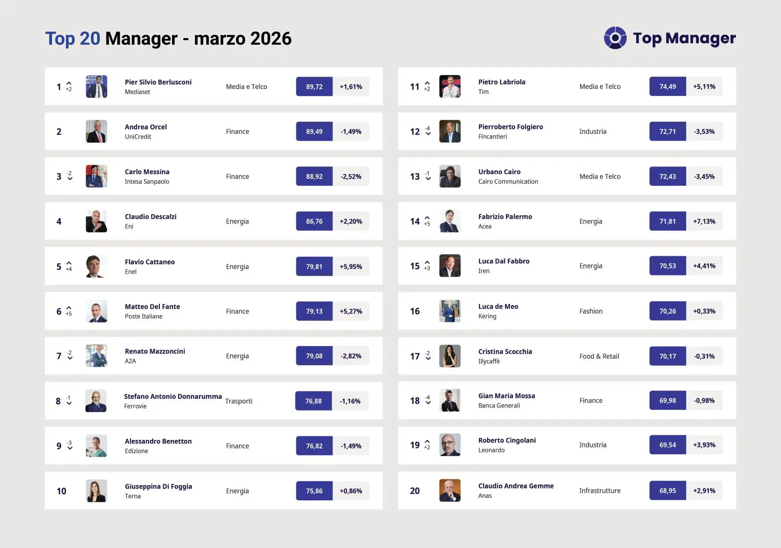 Scala quattro posizioni fino alla quinta Flavio Cattaneo (79.81) che al Capital Market Day rivendica il raggiungimento dei risultati promessi, con una capitalizzazione di mercato cresciuta del 50% e un nuovo piano da 53 miliardi di investimenti. Al sesto arriva in volata Matteo Del Fante (79.13), che sta tentando la scalata in TIM e ha condotto Poste a utili record con 13,1 miliardi di ricavi. Settimo l’Ad di A2A Renato Mazzoncini (79.08), ottavo Stefano Donnarumma (76.88) di FS, nono il presidente di Edizione Alessandro Benetton (76.82). Al decimo Giuseppina Di Foggia (75.86), Ad di Terna. All’undicesimo sale di due Pietro Labriola (74.49), grazie a risultati di TIM sopra le attese, seguito da Pierroberto Folgiero (72.71) e Urbano Cairo (72.43). Al quattordicesimo sale di cinque Fabrizio Palermo (71.81) tra la candidatura alla futura guida di Mps e il record di +45% dei profitti 2025 di Acea. Quindicesimo Luca Dal Fabbro (70.53), presidente di Iren che ottiene dalla Bei 225 milioni per promuovere l’economia circolare e l’efficienza energetica. Luca de Meo (70.26) stabile al sedicesimo. Chiudono la Top 20: Cristina Scocchia (70.17), Gian Maria Mossa (69.98), Roberto Cingolani (69.54), Claudio Andrea Gemme (68.95).
