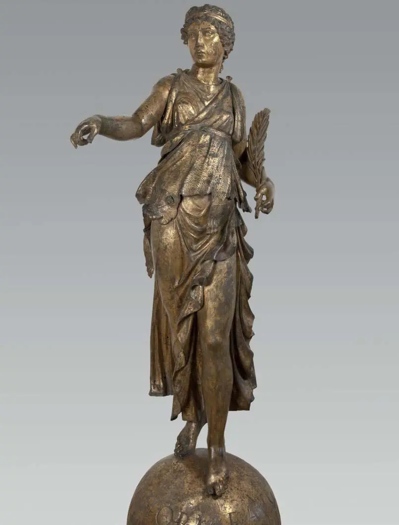 L’opera originale, com’è noto, fu rinvenuta nel 1836 a Calvatone (antica Bedriacum). Dai terreni emerse, durante operazioni di aratura spuntò una statua bronzea raffigurante la Vittoria Alata, databile tra il 161 e il 169 d.C. La stessa subì una serie di trafugamenti e ne fu fatta una copia identica all’originale. Per decenni si pensò che l’originale fosse andato distrutto durante il secondo conflitto bellico mondiale. Di recente è stato scoperto che la statua originale è custodita al Museo dell’Hermitage di San Pietroburgo.
